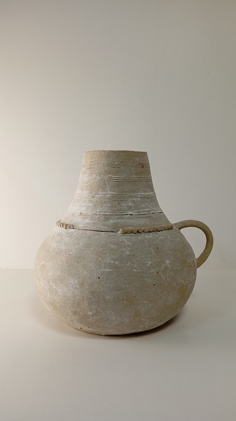 Pieza realizada a base de churros y con arcilla local con alto contenido en hierro en forma de sideritas recogida en el término de Oliete, además para darle un aspecto arqueológico ha sido recubierta antes de la cocción con arena blanca recogida en el término Monforte de Moyuela (Teruel)