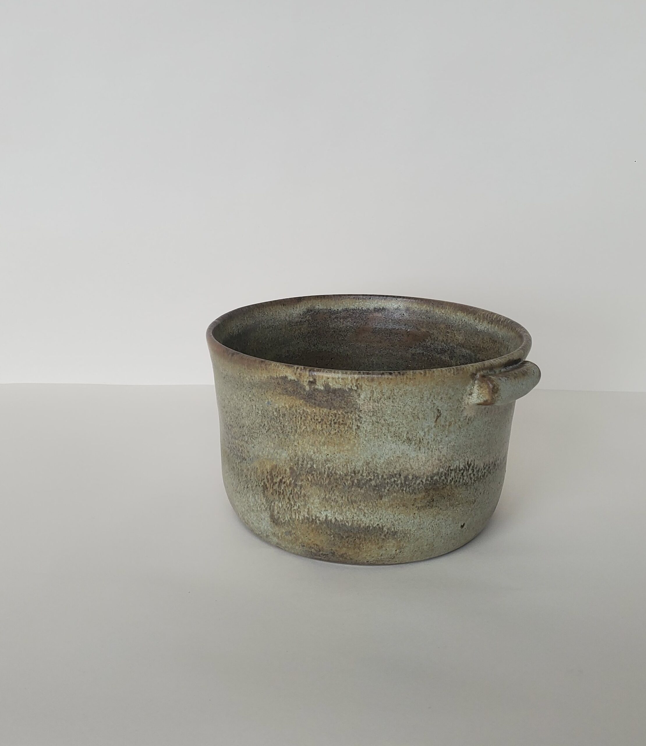 Pieza de vajilla utilitaria realizada con pasta compuesta por arcillas locales y la superposición de dos esmaltes no tóxicos de formulación propia. Acabado satinado e irregular aplicado con pincel