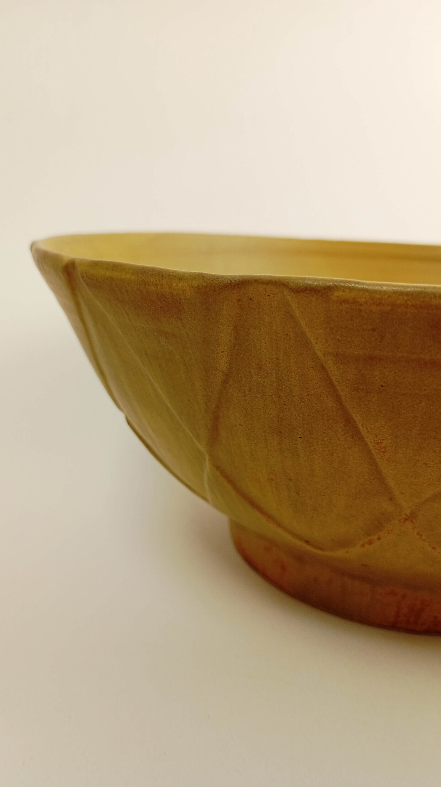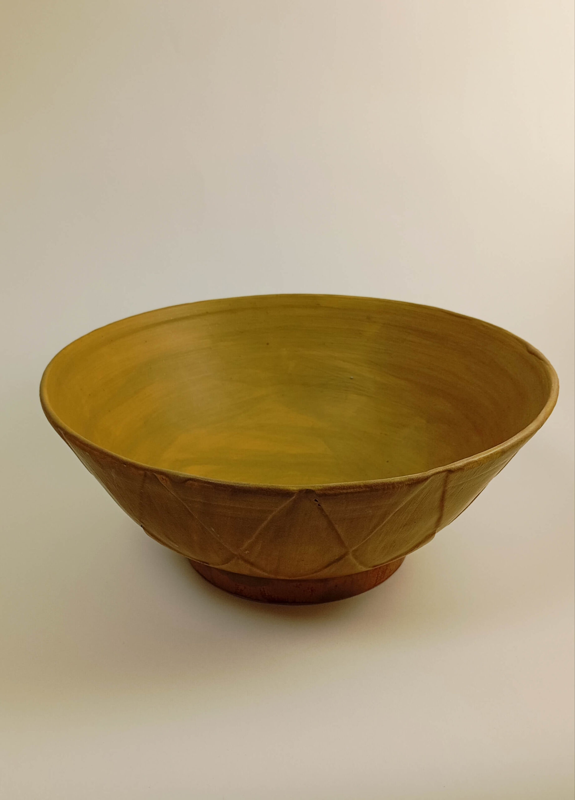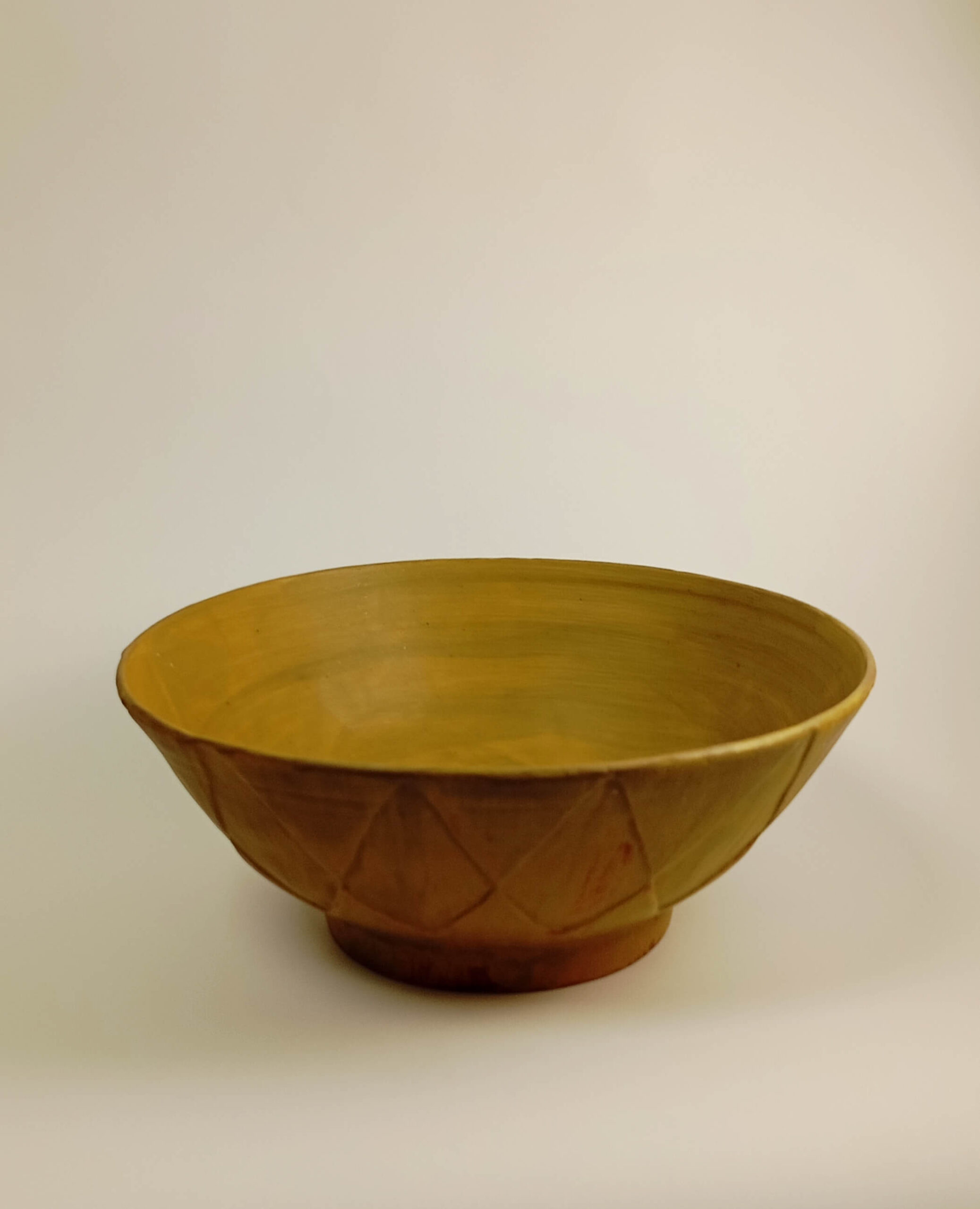 Pieza de vajilla utilitaria realizada con pasta compuesta por arcillas locales y esmalte realizado con una arcilla local de baja temperatura no tóxica. Para realzar su forma se han trabajado rombos en bajo relieve.